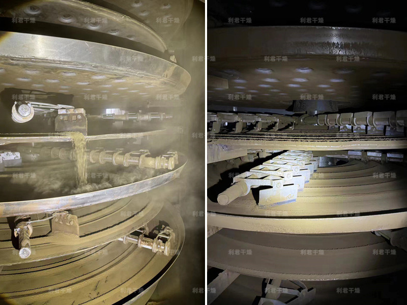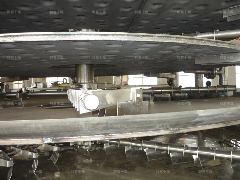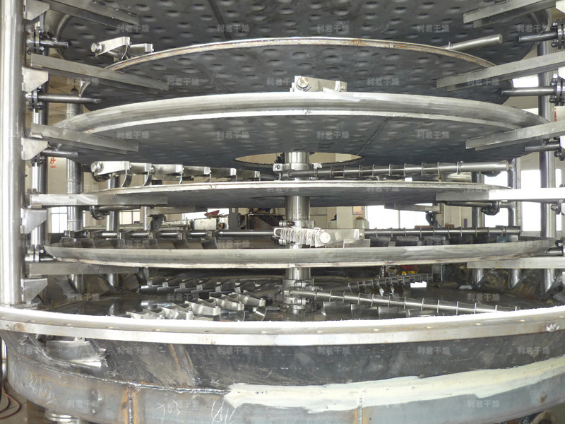 濕物料自加料器連續(xù)地加到干燥器上部第一層干燥盤上,帶有耙葉的耙臂作回轉(zhuǎn)運(yùn)動(dòng)使耙臂作回轉(zhuǎn)運(yùn)動(dòng)使耙葉連續(xù)地翻抄物料。物料沿指數(shù)螺旋線流過干燥盤表面,在小干燥盤上的物料被移送到外緣,并在外緣落到下方的大干燥盤外緣,在大干盤上物料向里移動(dòng)并從中間落料口落如下一層小干燥盤中。大小干燥盤上下交替排列,物料得以連續(xù)地流過整個(gè)干燥器。中空的干燥盤內(nèi)通入加熱介質(zhì),加熱介質(zhì)形式有飽和蒸汽、熱水和導(dǎo)熱油,加熱介質(zhì)由干燥盤的一端進(jìn)入,從另一端導(dǎo)出。已干物料從最后一層干燥盤落到殼體的底層,最后被耙葉移送到出料口排出。濕份從物料中逸出,由設(shè)在頂蓋上的排濕口排出,真空型盤式干燥器的濕氣由設(shè)在頂蓋上的真空泵口排出。從底層排出的干物料可直接包裝。通過配加翅片加熱器、溶劑回收冷凝器、袋式除塵器、干料返混機(jī)構(gòu)、引風(fēng)機(jī)等輔機(jī),可提高其干燥的生產(chǎn)能力,干燥膏糊狀和熱敏性物 料,可方便地回收溶劑,并能進(jìn)行熱解和反應(yīng)操作。