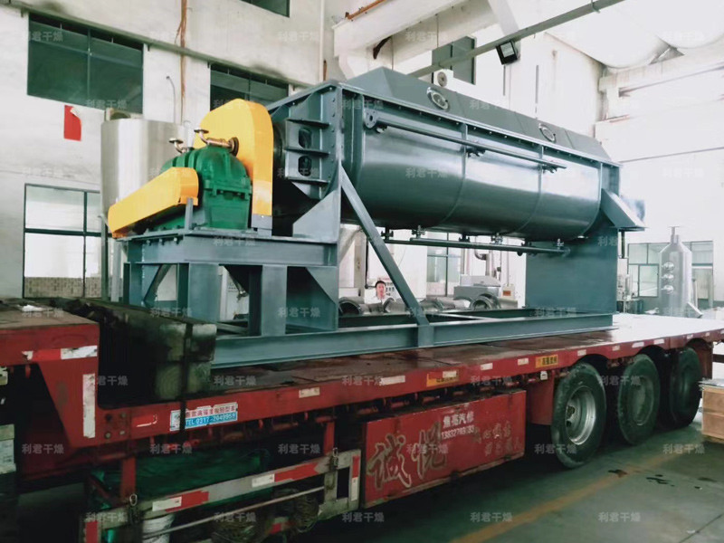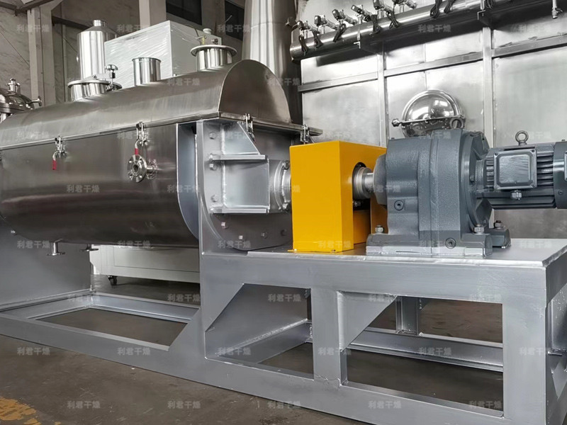 空心軸上密集排列著楔型中空漿葉,熱介質經空心軸流經漿葉。單位有效容積內傳熱面積很大,熱介質溫度從-40℃到320℃,可以是水蒸汽,也可以是液體型:如熱水、導熱油等。間接傳導加熱,沒有攜帶空氣帶走熱量,熱量均用來加熱物料。熱量損失僅為通過器體保溫層向環境的散熱。楔型漿葉傳熱面具有自清潔功能。物料顆粒與楔型面的相對運動產生洗刷作用,能夠洗刷掉楔型面上附著物料,使運轉中一直保持著清潔的傳熱面。漿葉干燥機的殼體為Ω型,殼體內一般安排二到四根空心攪拌軸。殼體有密封端蓋與上蓋,防止物料粉塵外泄而充分發揮作用。