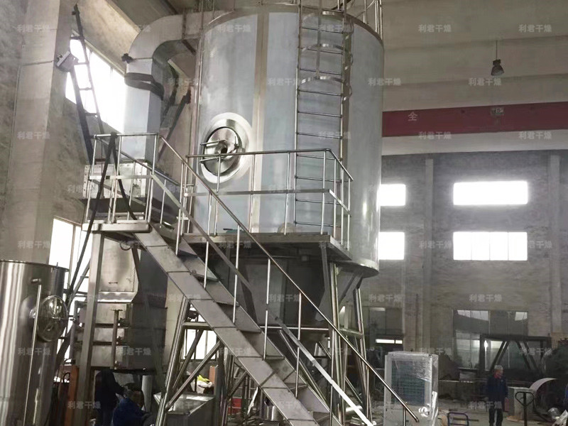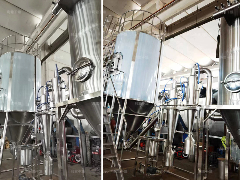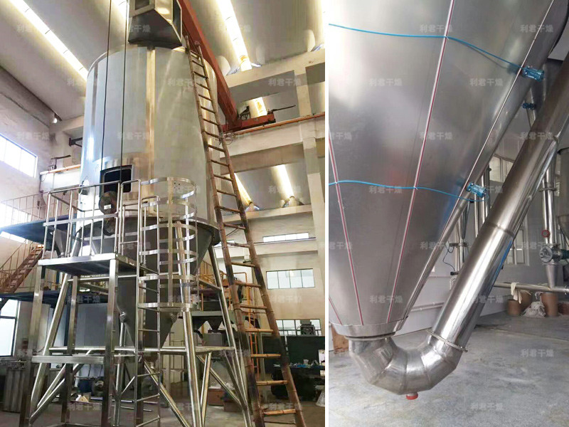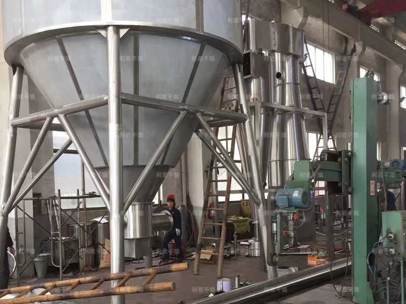 空氣經過濾和加熱,進入干燥器頂部空氣分配器,熱空氣呈螺旋狀均勻地進入干燥室。料液經塔體頂部的高速離心霧化器,(旋轉)噴霧成極細微的霧狀液珠,與熱空氣并流接觸在極短的時間內可干燥為成品。成品連續地由干燥塔底部和旋風分離器中輸出,廢氣由風機排空。