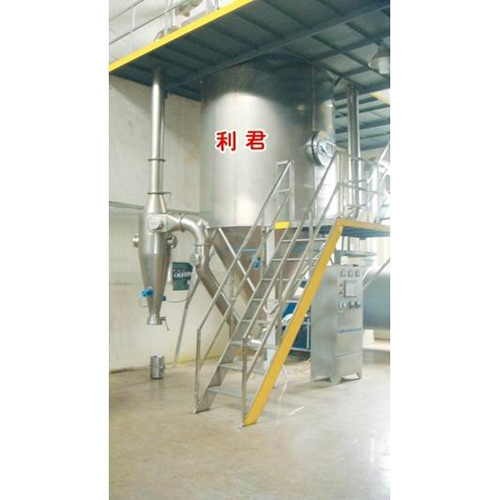 空氣經(jīng)過過濾和加熱,進入干燥器頂部空氣分配器,熱空氣呈螺旋狀均勻地進入干燥室。料液經(jīng)塔體頂部的高速離心霧化器(旋轉(zhuǎn))噴霧成極細微的霧狀液珠,與熱空氣并流接觸,在極短的時間內(nèi)可干燥為成品。成品連續(xù)地由干燥塔底部和旋風分離器中輸出,廢氣由風機排空。